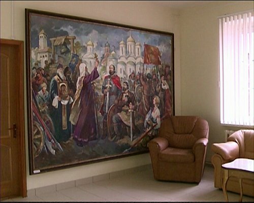 Интерьер на входе слегка обновленный. Появилась новая плитка и картина маслом на тему выхода из смуты 1612 года. Похоже, таким произведением искусства решили напомнить избранникам о высокой миссии. В кулуарах сейчас активно обсуждаются возможные кандидатуры на пост председателя муниципалитета.